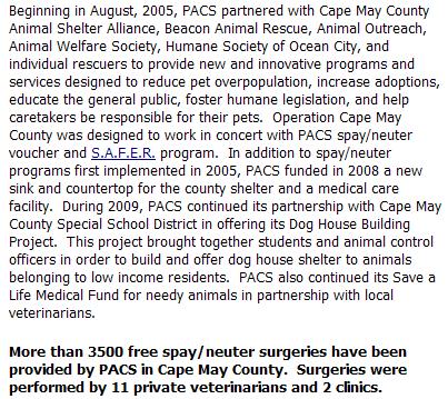 The hard work and dedication of all the animal advocates in Cape May County has paid off for the animals! Cape May County effectively reached no-kill status in 2010. Congratulations to one and all! We need to continue with the programs and not let up for a minute. Paws and Claws Society contributions to this achievement are many. Read more: